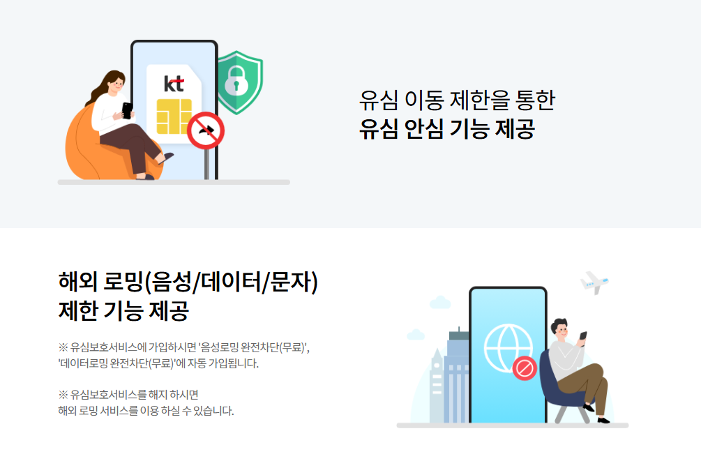 KT는 유심에 안심 설정을 하여 다른 휴대폰으로의 기기변경 및 해외 로밍 사용을 제한하는 기능을 설정하고 있습니다.