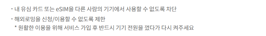 -특이사항: 휴대폰 분실 시에도 잠금이 유지되며, 해제 시 본인 직접 인증 필수, 해외로밍서비스를 이용할 수 없습니다.