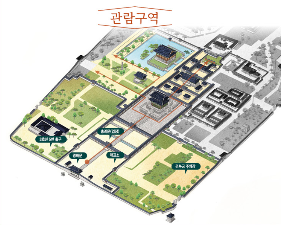 야간개장은 평상시보다 조명이 들어와 색다른 분위기를 자아내는 경복궁을 자유롭게 관람할 수 있다는 점에서 매력적입니다. 단, 일부 구역은 야간에는 안전상의 이유로 개방되지 않으며, 주요 관람 구역은 다음과 같습니다.
