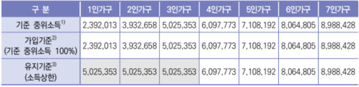유지기준 : 청년의 총 근로, 사업소득이 기준 중위소득 100% 이하