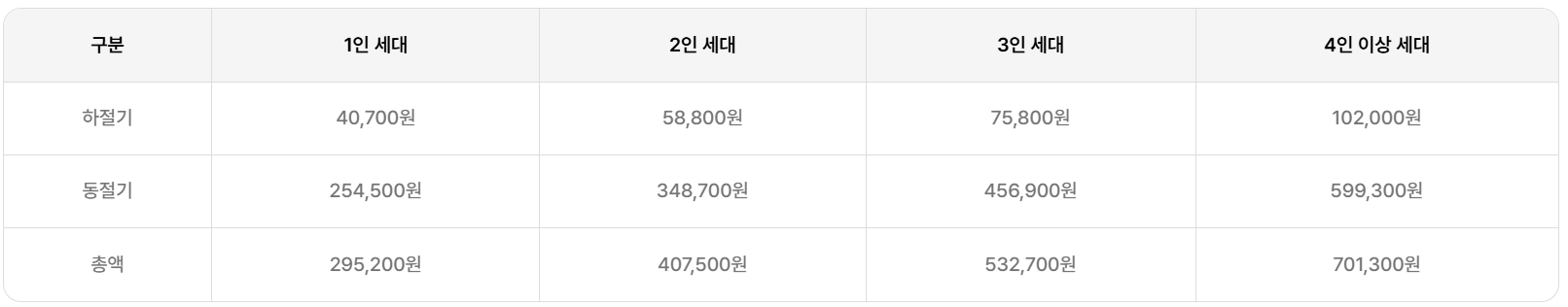 여름(7~9월)에는 전기 요금 차감을, 겨울(10월~익년 5월)에는 전기 / 도시가스 / 지역난방 / 등유 / 연탄 / LPG 중 한 가지를 선택하여 구입할 수 있는 전자바우처(이용권)를 세대원수에 따라 4단계 차등 지급합니다.