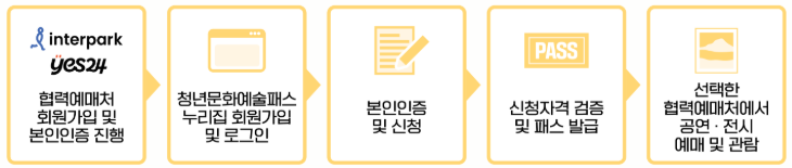 ※ 신청 전 청년문화예술패스를 사용할 협력예매처(2곳 중 선택 1) 회원가입 및 본인인증이 완료되어야 정상 발급 가능
