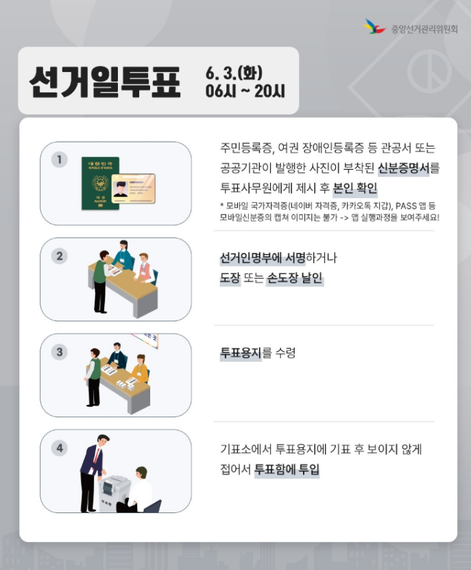 선거일 투표는 지정된 투표소에서만 가능하므로, 사전에 투표소 위치를 확인하시기 바랍니다. 신분증은 반드시 지참해야 하며, 모바일 신분증도 사용할 수 있습니다.