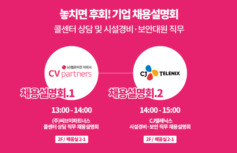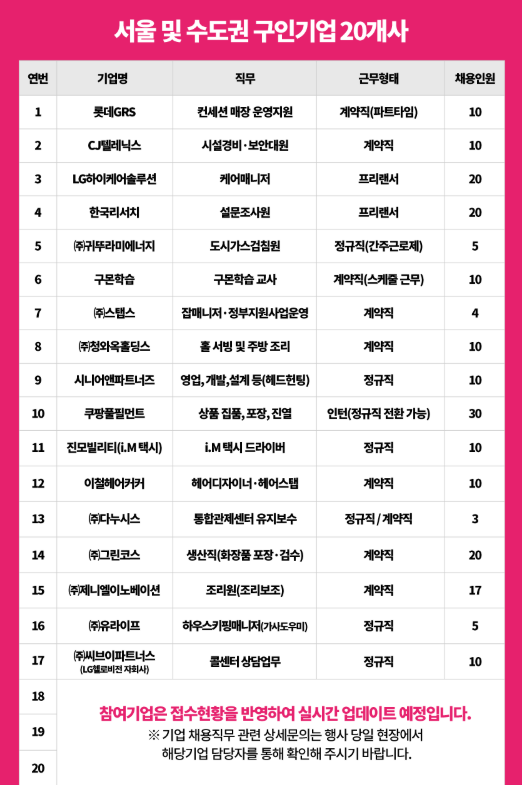 📌 참여기업: 롯데GRS, CJ텔레닉스, LG하이케어솔루션, 한국리서치, (주)귀뚜라미에너지, 구몬학습, 쿠팡풀필먼트 등 서울 및 수도권 구인기업 20여 개 사