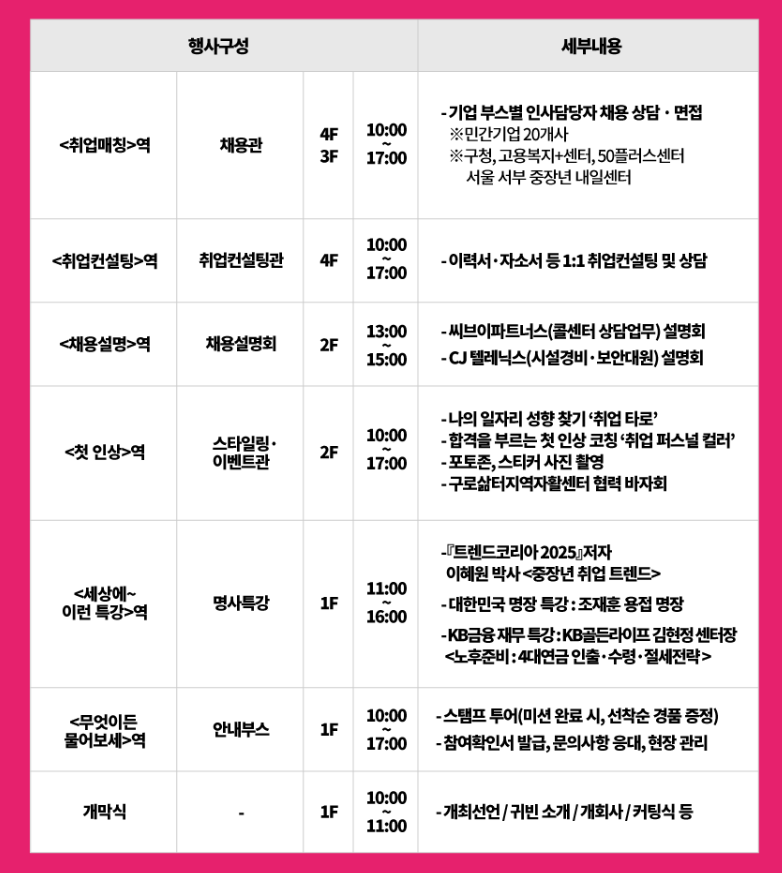 이번 박람회는 단순 채용설명회가 아닙니다. 중장년층의 특성을 고려해 실질적인 채용 연계와 역량 개발을 위한 프로그램이 풍성하게 구성되어 있고 기업채용관 / 채용설명회 / 취업컨설팅 / 취업특강 / 첫인상 코칭 / 스탬프 투어(선착순 경품 증정) 프로그램 등이 예정되어 있습니다.