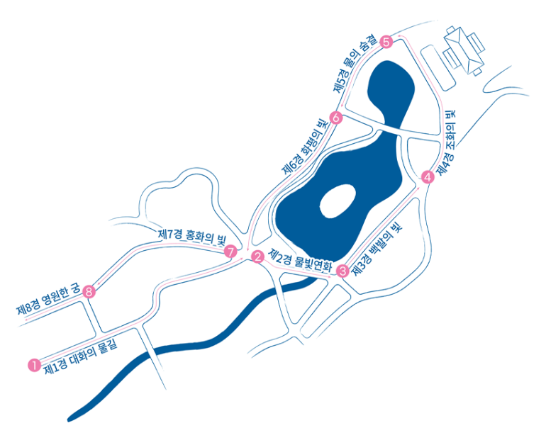 2025 창경궁 물빛연화는 춘당지 일대를 중심으로 ‘빛의 여정’이라는 테마 아래 8개의 구간으로 구성되어 있습니다.