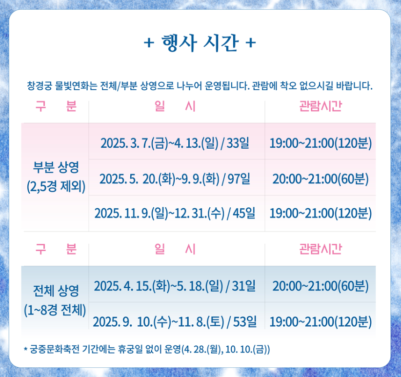 -날씨, 공사, 행사 진행 상황에 따라 운영 일정은 변경될 수 있으며, 실시간 안내는 창경궁 홈페이지에서 확인 가능합니다.