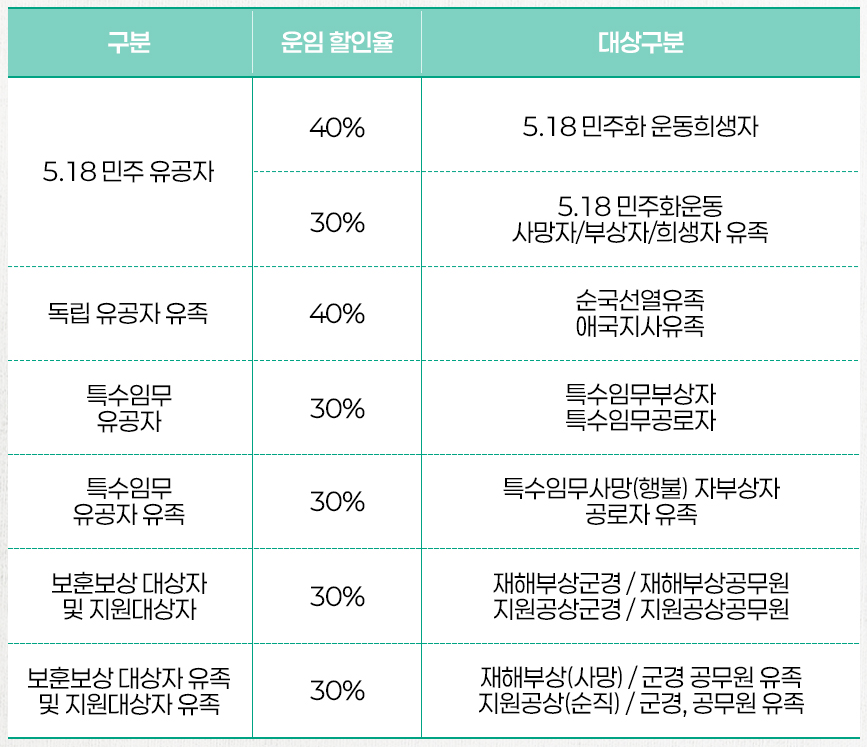 다음과 같은 국가보훈 대상자 및 동반자가 할인 혜택을 받을 수 있습니다: